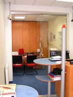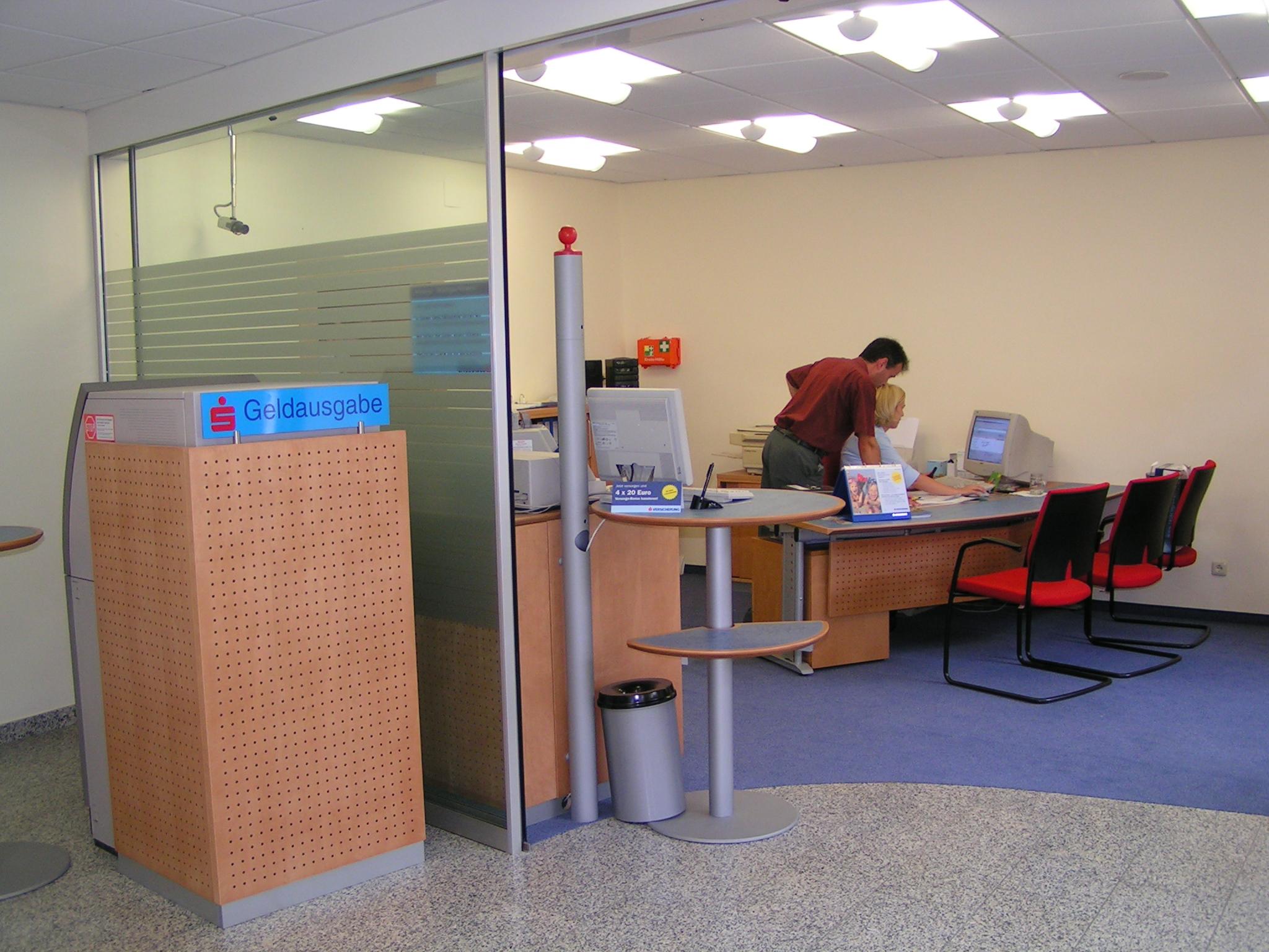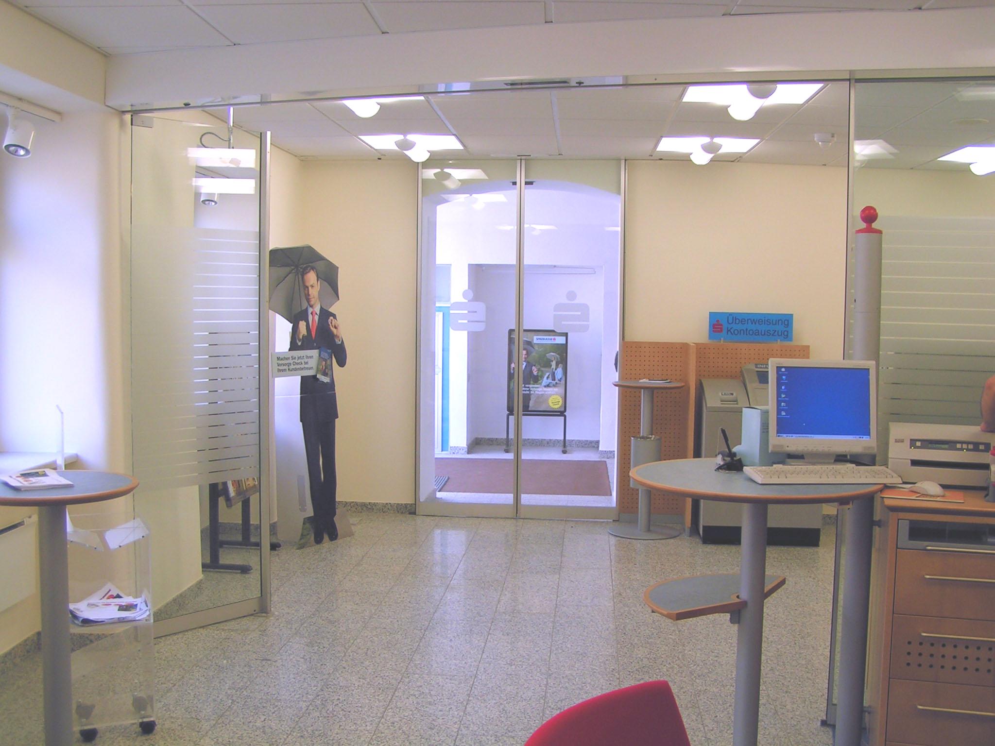 Als zentrales raumgestalterisches Element wurde eine 3-teilige Glaswand montiert. Diese trennt die SB-Zone vom Service- Beratungs- und Bach-Office-Bereich. Ein Fixteil deckt das Pult und die Kästen ab. Ein elektrisch bedienbarer Glasflügel kann für die Wahrung der Diskretion geschlossen werden. Eine zusätzlich angeordnete Drehtüre erlaubt eine Raumvergrößerung für Veranstaltungen. Mit einer ausgewogenen Material- und Farbwahl wurde ein angenehmer Gesamteindruck hergestellt.
